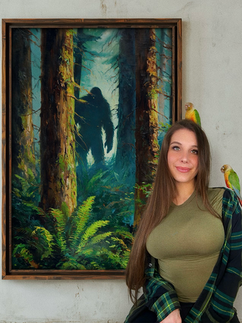 Some of my paintings tell stories of cryptids hidden in forests and shadowed landscapes. Others dissolve into abstraction, capturing the atmosphere, color, and emotional energy of the natural world.